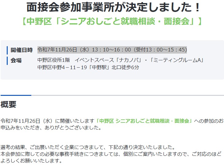 🚖 「中野区シニアおしごと就職相談・面接会」 開催概要