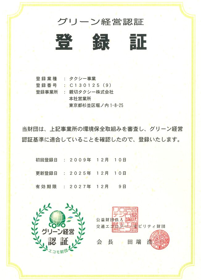 親切タクシーの環境保全の取り組みにより、2009年12月10日「グリーン経営認証」を取得致しました。