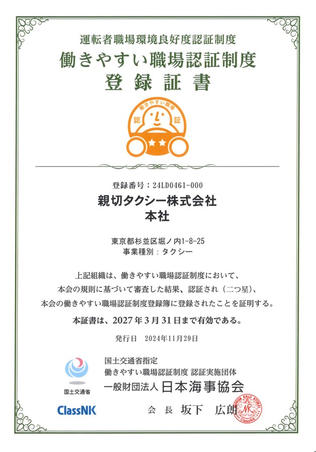 親切タクシー株式会社では、2021年の「働きやすい職場認証制度」の「一つ星」認証に続けて、2023年6月に「二つ星」認証を取得させていただきました。その後、2024年11月に更新申請に見事合格し継続登録を行っております。